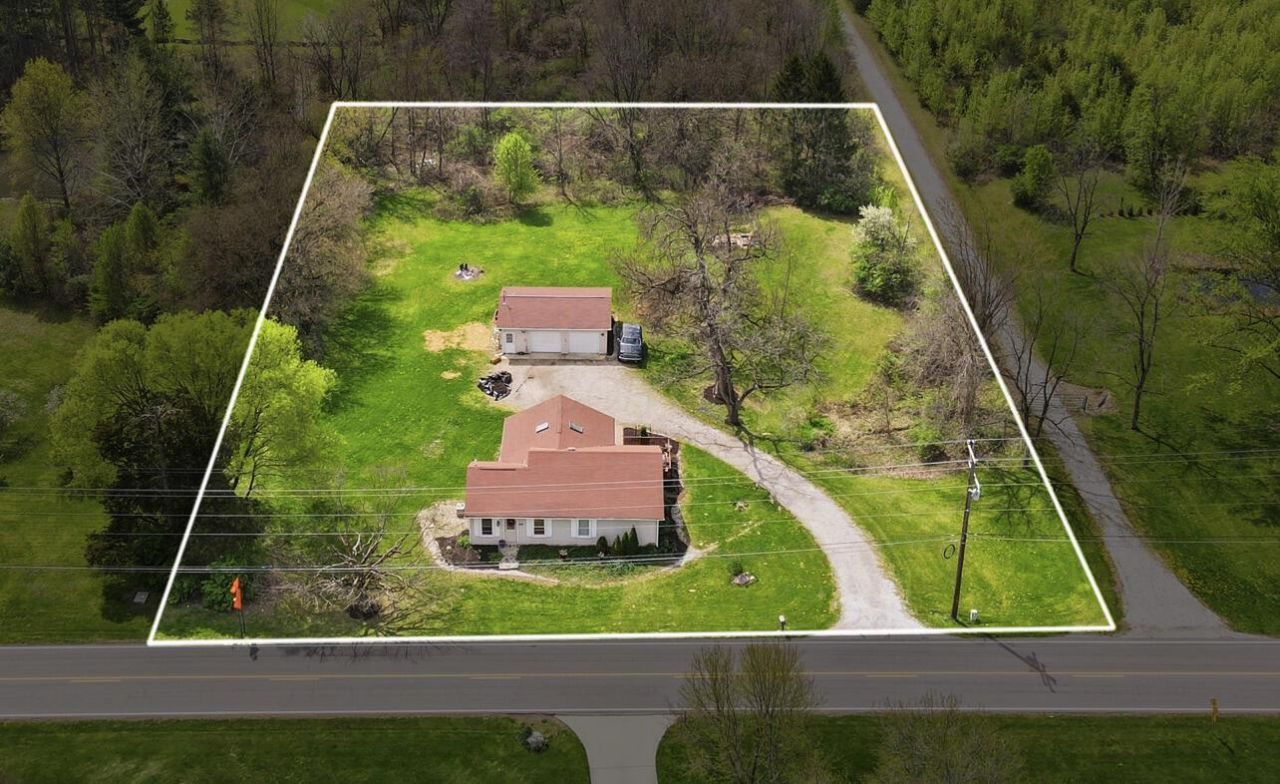 OPEN HOUSE SUNDAY, 4/19/26, 12-2PM. Unique early 1900s home on 1.1 acre parcel with privacy (wooded- on 3 sides) and a more modern addition added to it (1989), offering an open living / dining / kitchen area. This area features a vaulted ceiling with skylights and gleaming hardwood floors! The great room features many windows and natural light and a door to the deck. The kitchen has painted cherry cabinets and island with salt stone solid countertops, pot and pan rack, shelving and stainless steel appliances. The original large living room / laundry room, has 4 windows and is currently being used as a children's play room and bedroom. It could be another living space or an office, with private entry. The laundry room has been moved to the closet next to the full bathroom and the washer/dryer do transfer. The full bathroom has a long vanity with 2 sinks and a makeup area, a tub / shower and tile floor. The largest bedroom has patio doors to the deck and a walk-in closet. There are 2 other bedrooms with good sized closets, one of which is smaller and is currently being used as a den. It would also make a good nursery or young child's bedroom. There is potential for a total of 4 bedrooms. The 2 1/2 car detached garage is 660 square feet, which offers ample storage. The workbench and built-in shelving transfer and there is still plenty of room for a riding mower! The 1.1 acre lot offers generous space for kids or dogs to run, for a large garden and parking. Close to ST. RT. 23, Delaware and Lewis Center shopping and dining. The property does have Delco water and septic and it feeds into Olentangy schools!