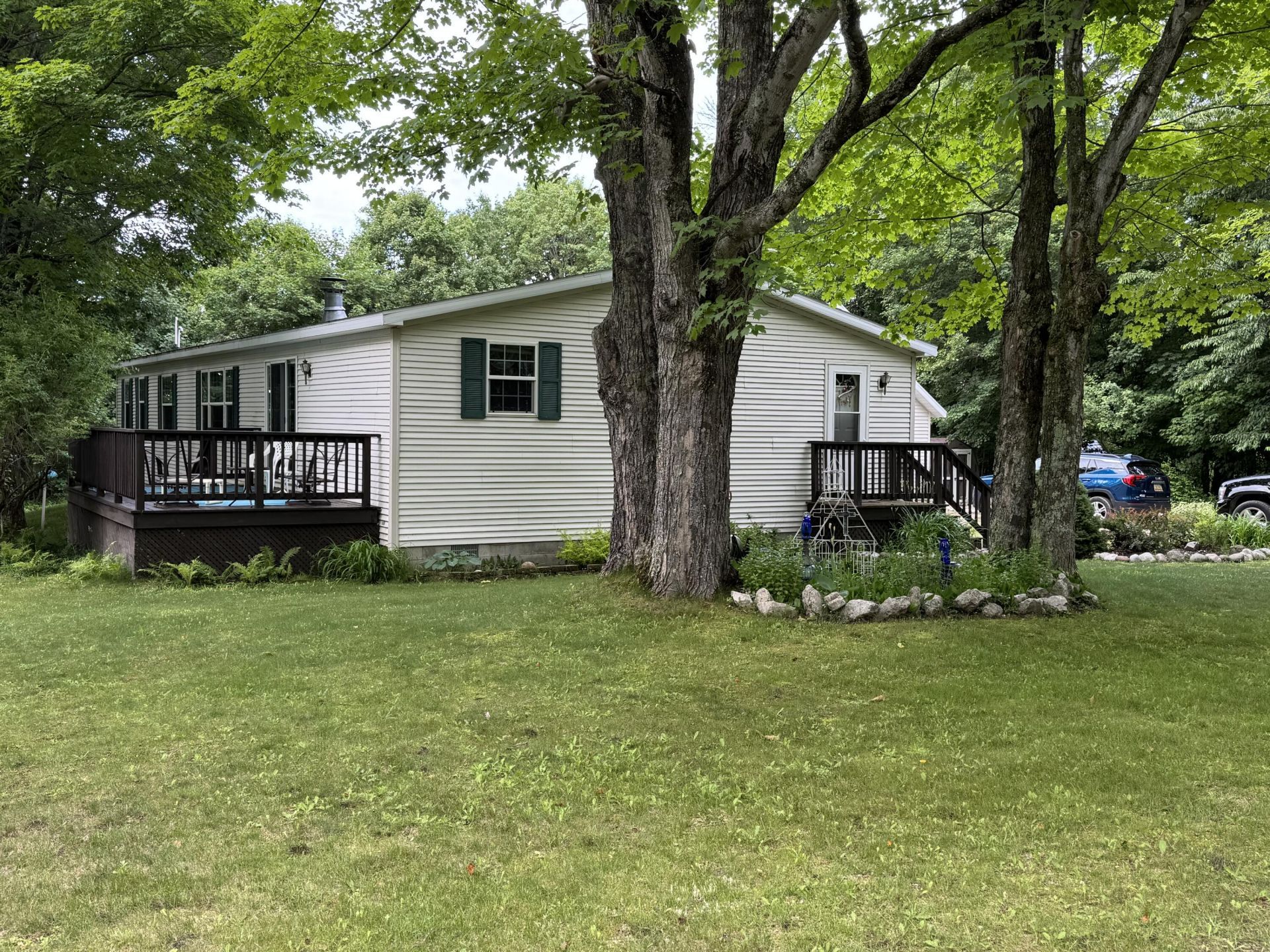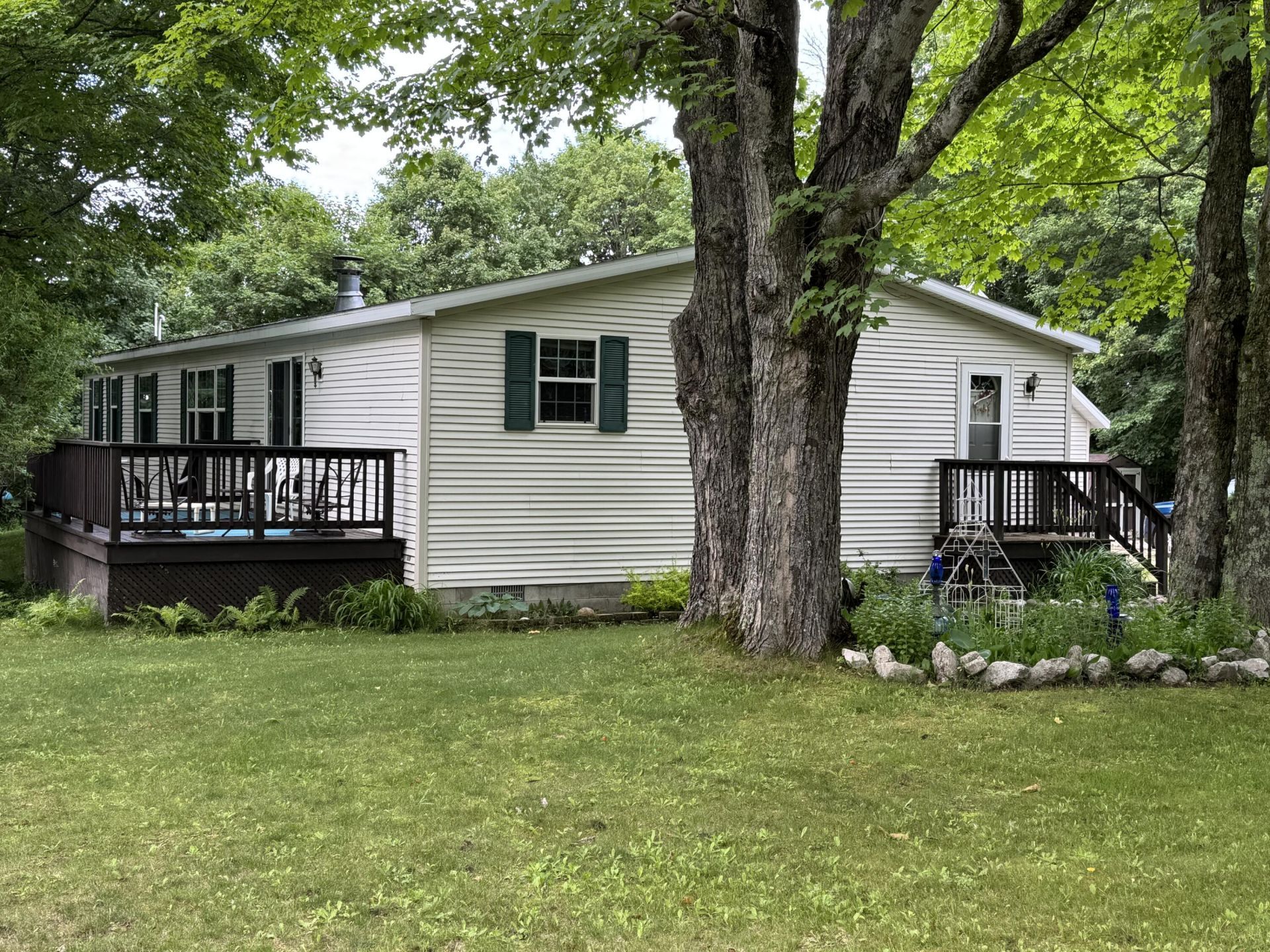 This is an impeccable 2001-02 manufactured 3 bedroom home (one bedroom converted into a workout room), a hot tub in the spacious master bathroom, and a generously sized dining, living, kitchen area. The home also includes geothermal heat, air-conditioning, a gas fireplace, and a Generac generator for immediate electricity when the lights go out. The 4.2 acre property (within the Village Limits) includes a 2 car detached garage with second floor storage and an additional detached storage unit.